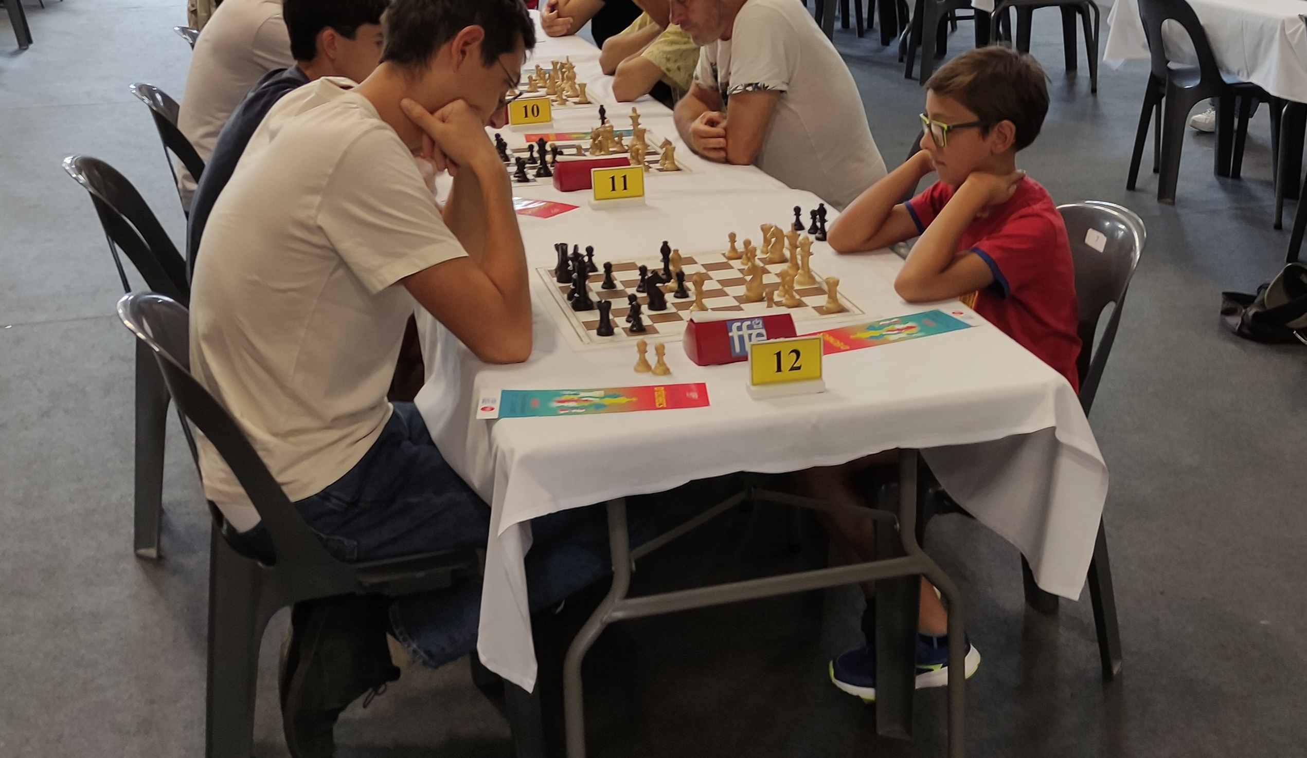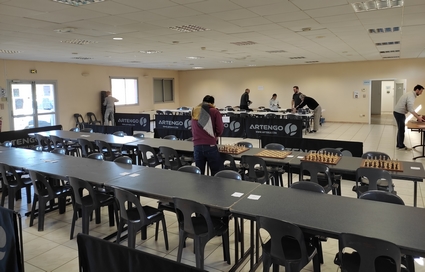 Dès 13 heures, les bénévoles de l’association, Olivier, Simon, Julien, Angel, Alain, Tien se réunissaient pour préparer la salle : mise en place des tables, des jeux et pendules, numérotation des échiquiers, pose de la bannière de l’Echiquier de La Pointe et de celle du CDJE81 (Comité départemental du Jeu d’échecs), espace arbitrage et buvette. La belle salle Auguste Milhès mise gracieusement à disposition du club par la Municipalité prenait vite fière allure.